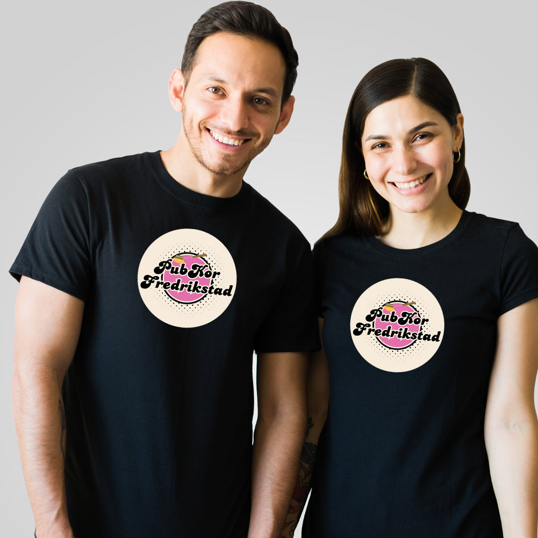Klassisk unisex sort T-shirt med flott trykk på bryst.